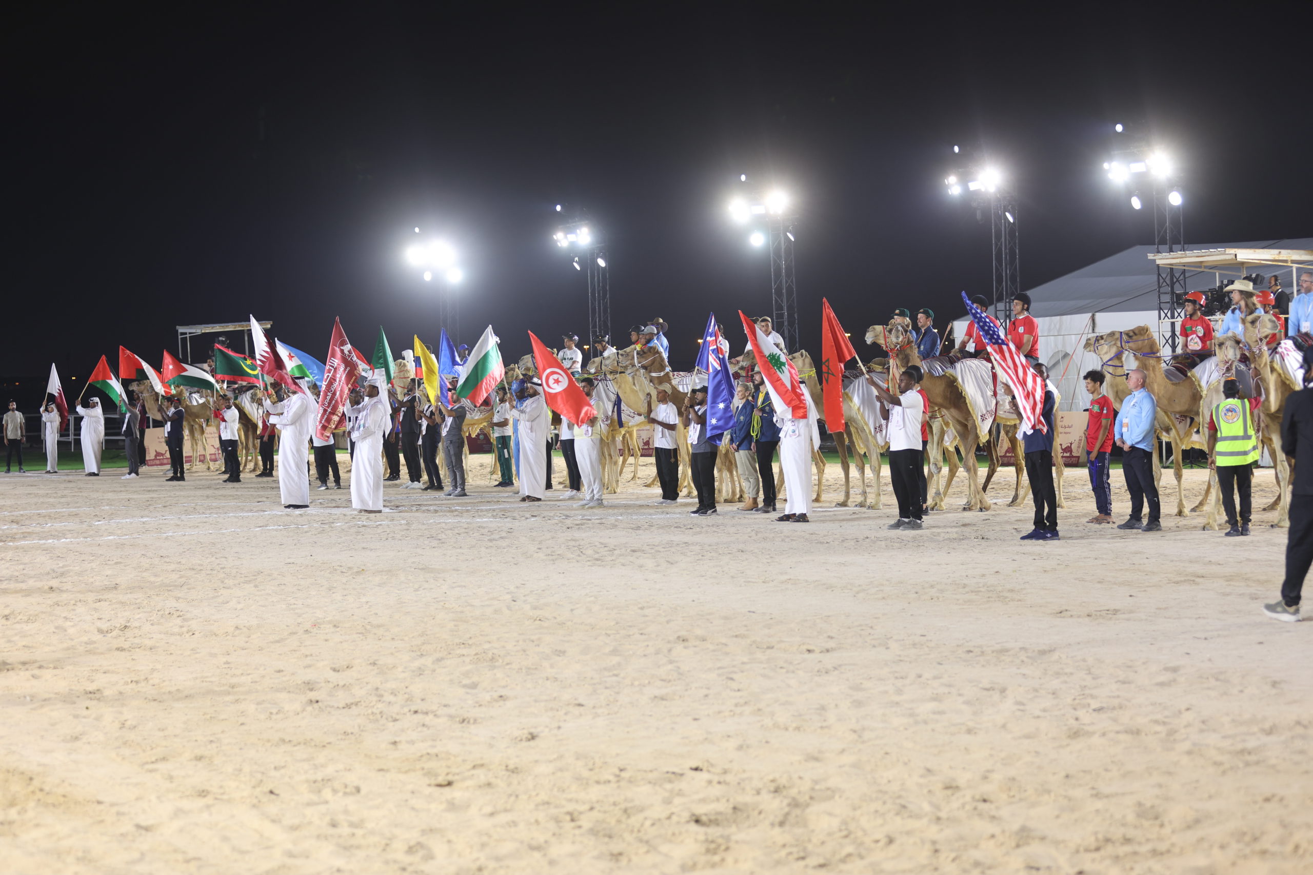 بعدها زينت الإبل الميدان وهي تحمل أعلام الدول لتُعلن انطلاق افتتاحية مباريات البطولة بين منتخب قطر صاحب الأرض والجمهور والمستضيف ضد منتخب لبنان .