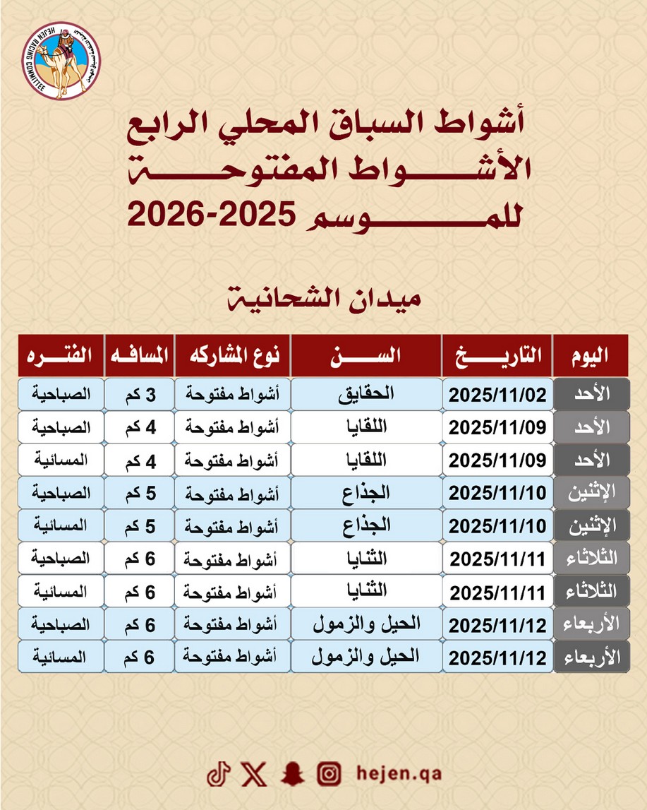 أعلنت اللجنة المنظمة لسباقات الهجن عن برنامج السباق المحلي الرابع لموسم 2025–2026، والذي يشهد عودة لنظام الفترتين الصباحية والمسائية خاصة بعد تحسن الأحوال المناخية، وكالعادة يتضمن السباق تحديات هجن أبناء القبائل (على ميداني الشحانية ولبصير)، وكذلك هجن أصحاب السمو والسعادة الشيوخ، حيث تنطلق المنافسات يوم الأحد الموافق 2 نوفمبر 2025، وتستمر حتى الأربعاء الموافق 12 نوفمبر 2025، وذلك عبر مسافات تترواح بين 3 و6 كيلومترات.
