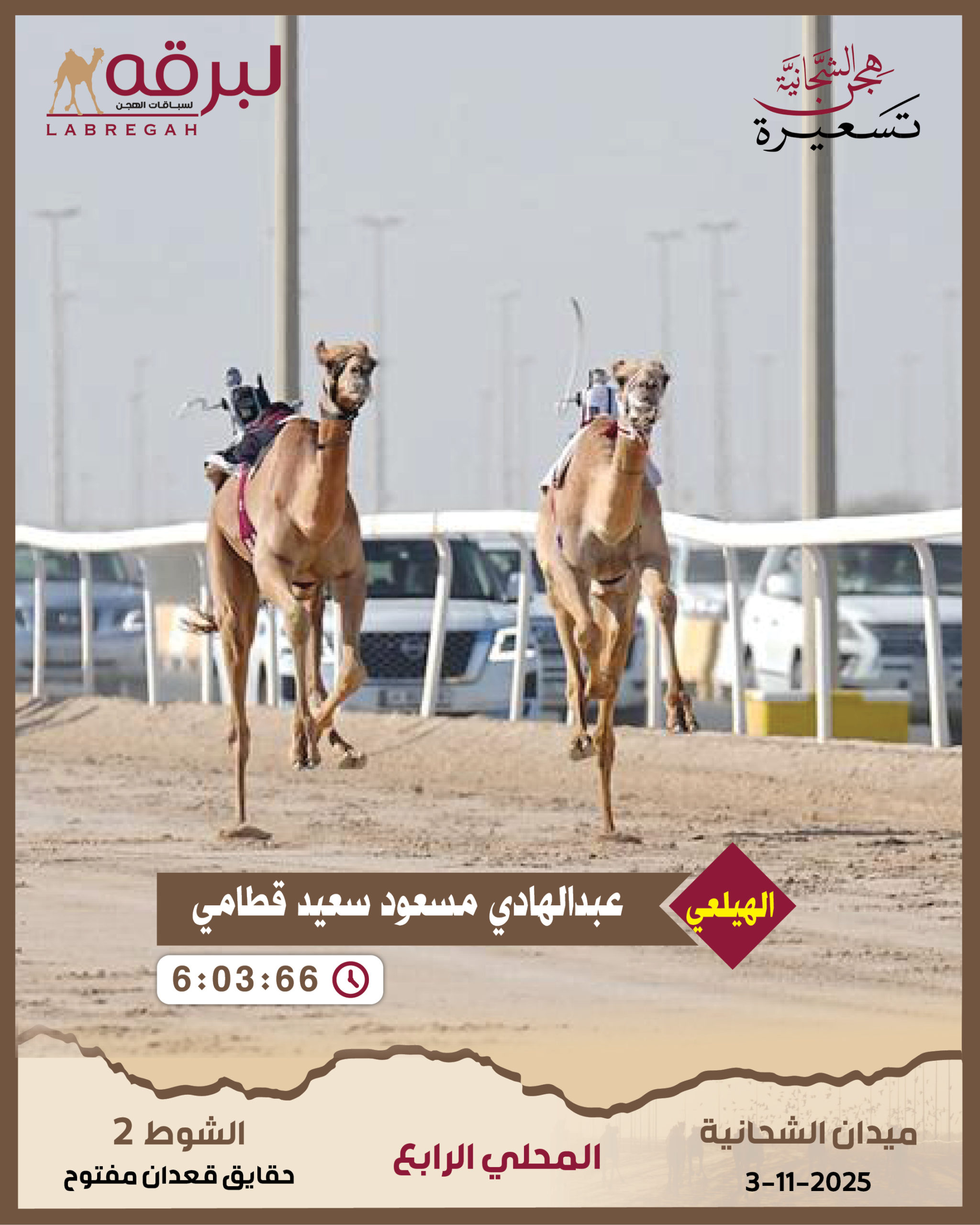 | قعدان مفتوح | 2 | متعب | حمد علي طالب الفهيده المري | 6:06:85 |