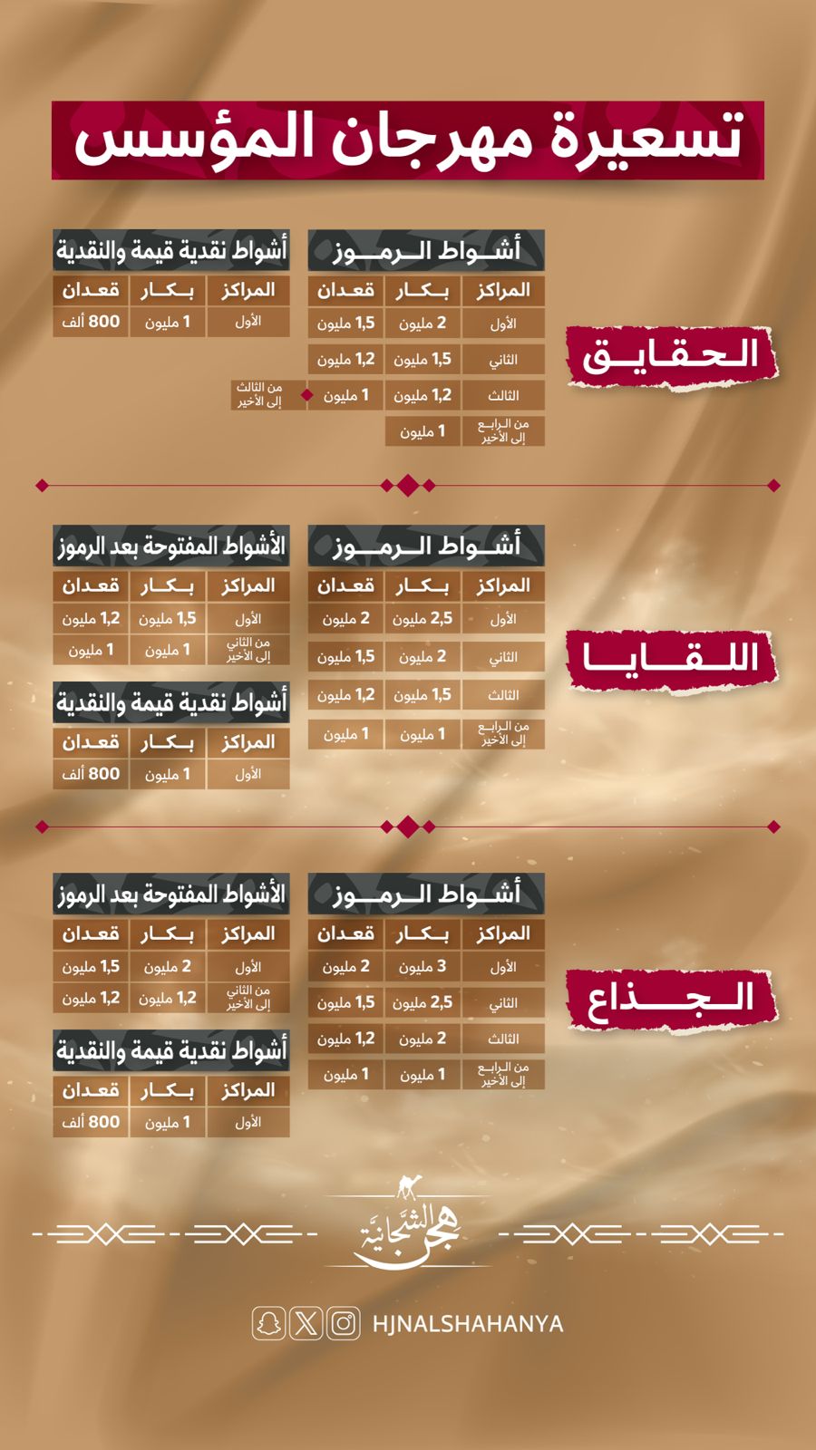 وأكدت اللجنة المنظمة أن اعتماد هذه التسعيرة يأتي في إطار الحرص على دعم ملاك ومضمري الهجن، وتعزيز التنافس الشريف، وترسيخ مكانة المهرجان كإحدى أبرز الفعاليات التراثية والرياضية، متوقعة منافسات قوية خلال أيام المهرجان.