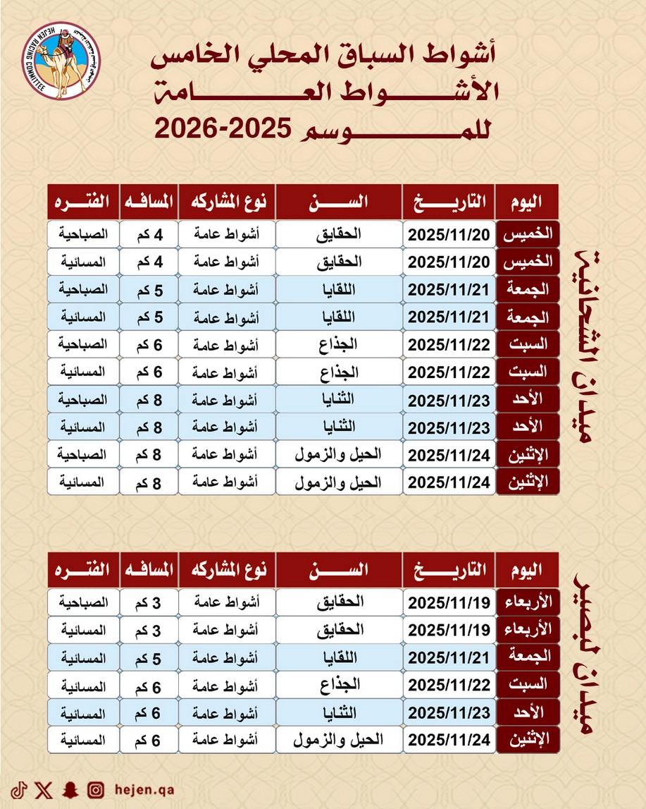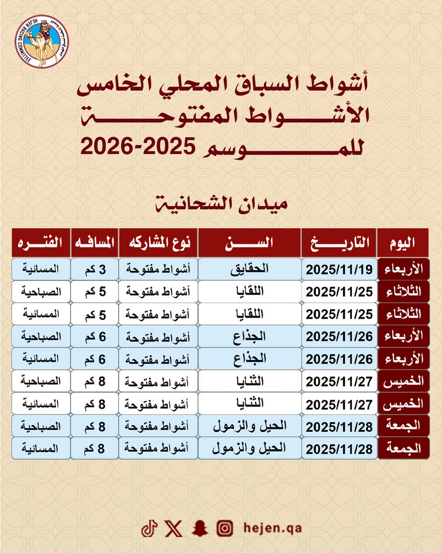 أعلنت اللجنة المنظمة لسباقات الهجن عن برنامج السباق المحلي الخامس، ضمن تحديات الموسم الحالي 2025/ 2026، حيث سيقام خلال الفترة من 19 وحتى 28 نوفمبر الجاري، على ميداني الشحانية ولبصير، بمشاركة هجن أصحاب السمو والسعادة الشيوخ، وهجن أبناء القبائل.