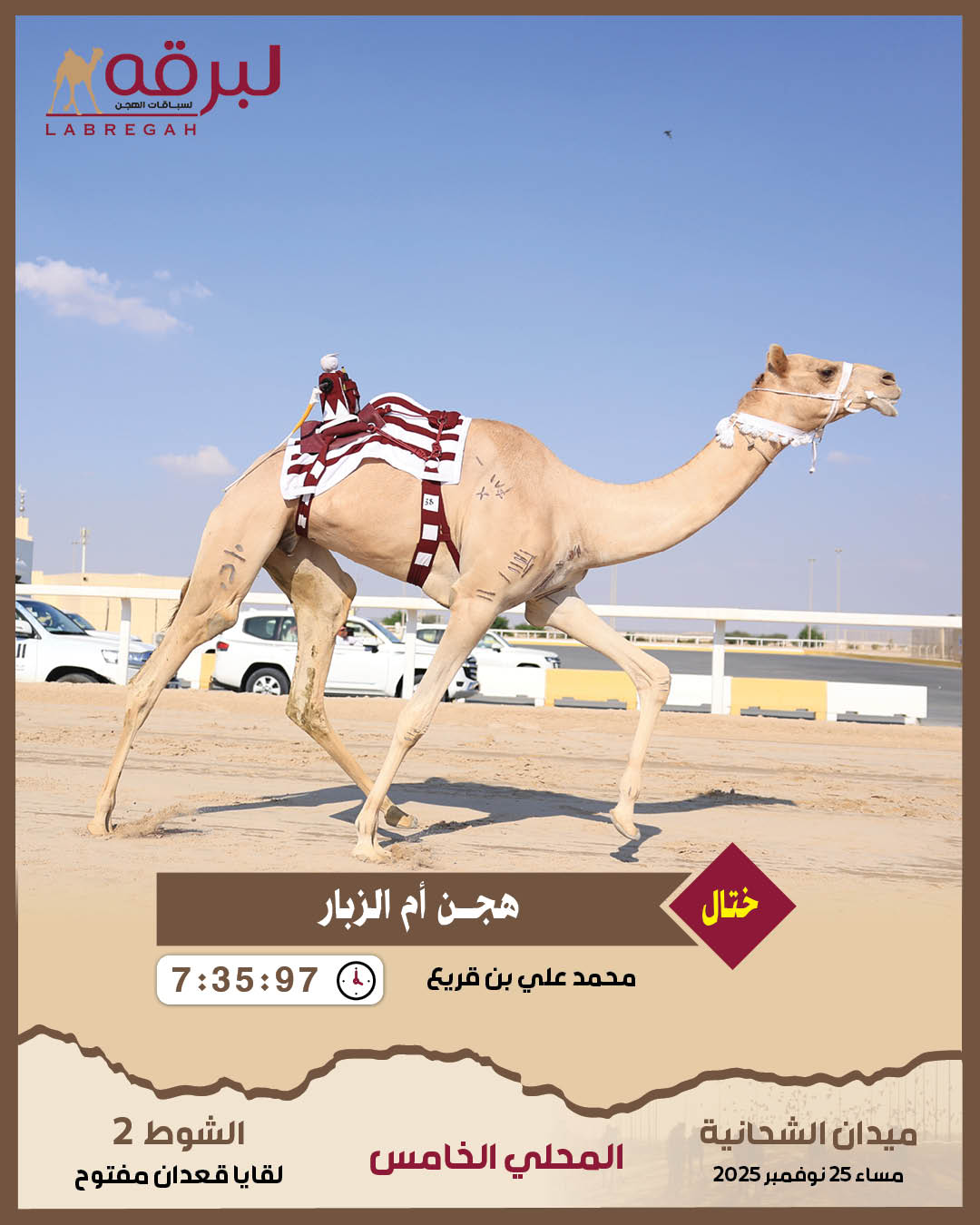 | قعدان مفتوح | 2 | مدهال | هجن أم الزبار | عبدالله علي حمد سلامه الهاجري | 7:39:34 |