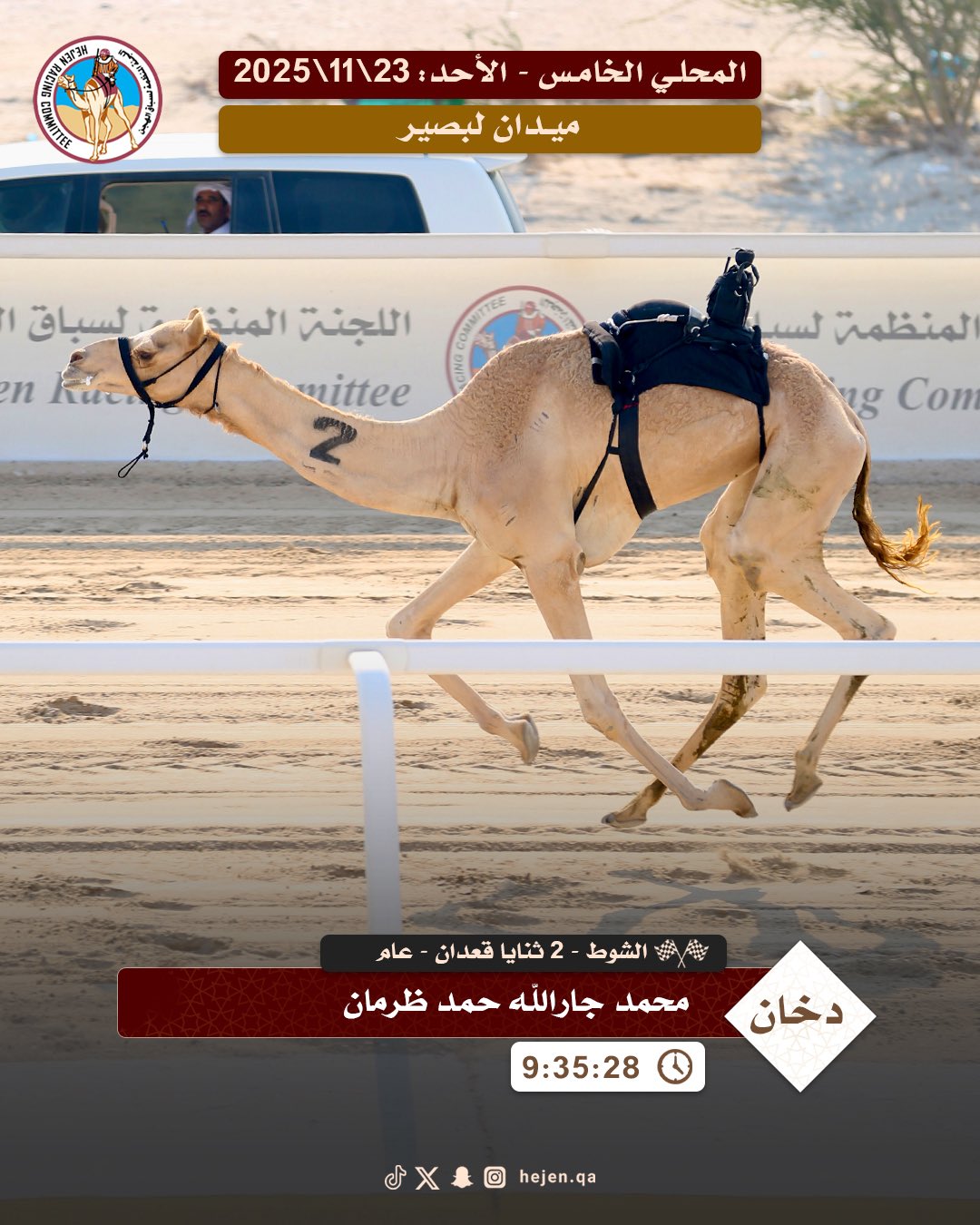 تواصلت الانطلاقات على أرضية ميدان لبصير، مساء اليوم الأحد 23 نوفمبر 2025، حيث تحديات سن الثنايا من هجن أبناء القبائل، من مسافة الـ 6 كم على مدار  6 أشواط.