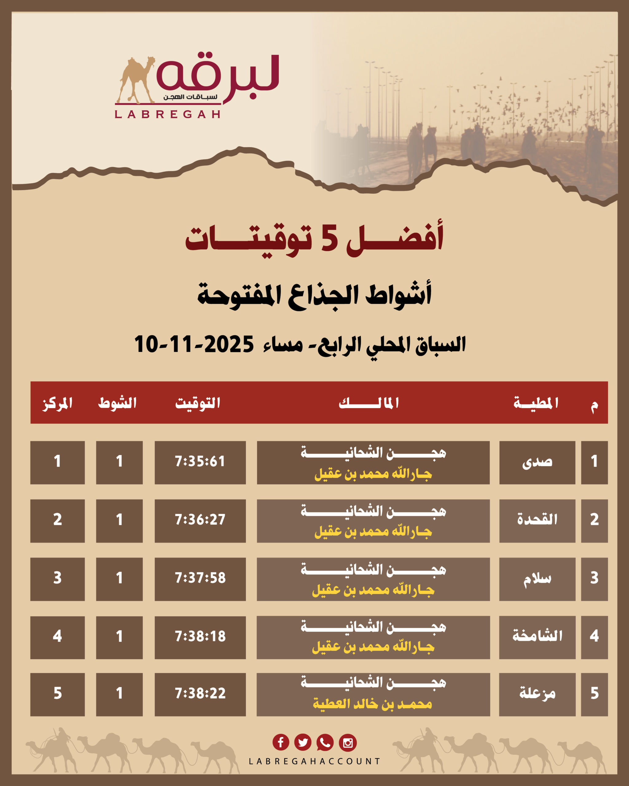 | بكار مفتوح | 3 | سلام | هجن الشحانية | جارالله محمد بن عقيل | 7:37:58 |