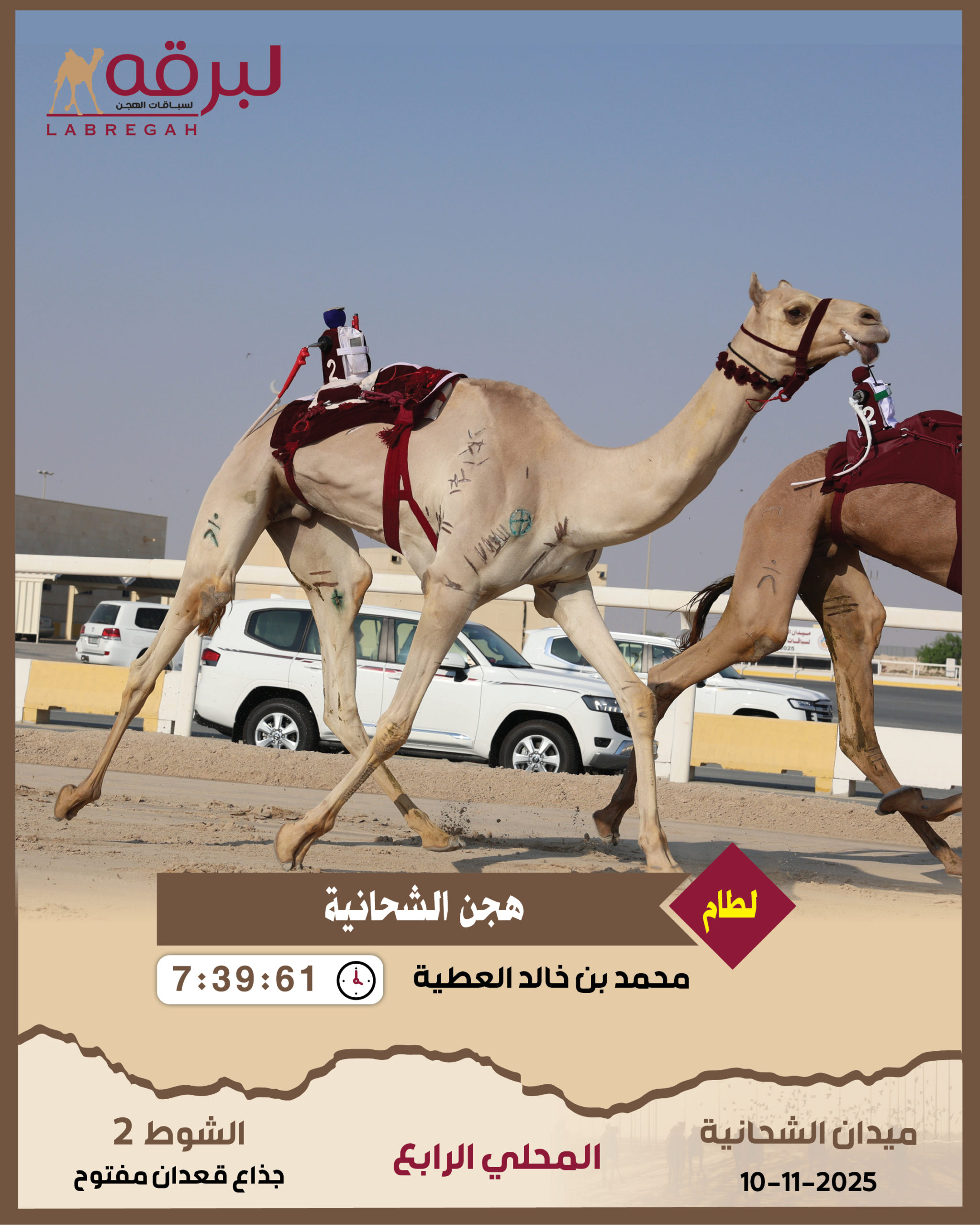 | الشوط الثاني | 1 | لطام | هجن الشحانية | محمد بن خالد العطية | 7:39:61 |