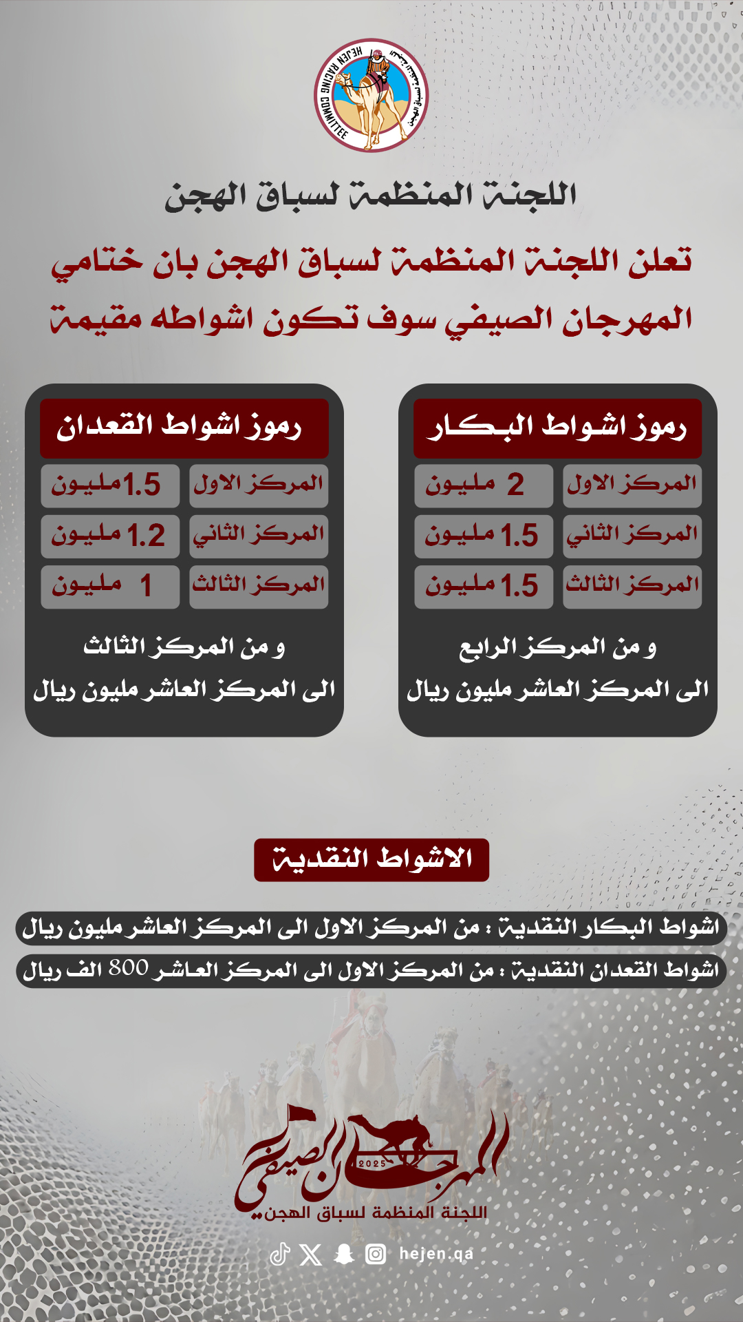 حددت اللجنة المنظمة لسباق الهجن القيمة التقديرية (التعسيرة) للهجن الفائزة بأشواط الرموز (بكار وقعدان) وكذلك الأشواط النقدية، وذلك في ختام المهرجان الصيفي للمفاريد 2025 ، والذي تقام منافساته تحت إشراف اللجنة المنظمة لسباق الهجن.
