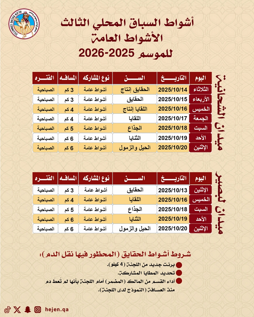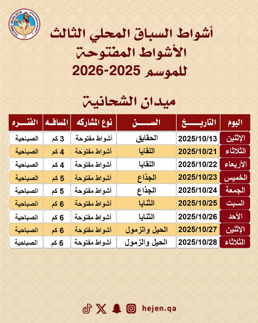 أعلنت اللجنة المنظمة لسباقات الهجن، عن برنامج السباق المحلي الثالث بالشحانية لموسم الجديد 2025/ 2026, والذي يتضمن منافسات الأشواط العامة (هجن أبناء القبائل)، والأشواط المفتوحة (هجن أصحاب السمو والسعادة الشيوخ)، وذلك على ميداني الشحانية الرئيسي ولبصير خلال الفترة من 13 أكتوبر وحتى 28 من الشهر نفسه.