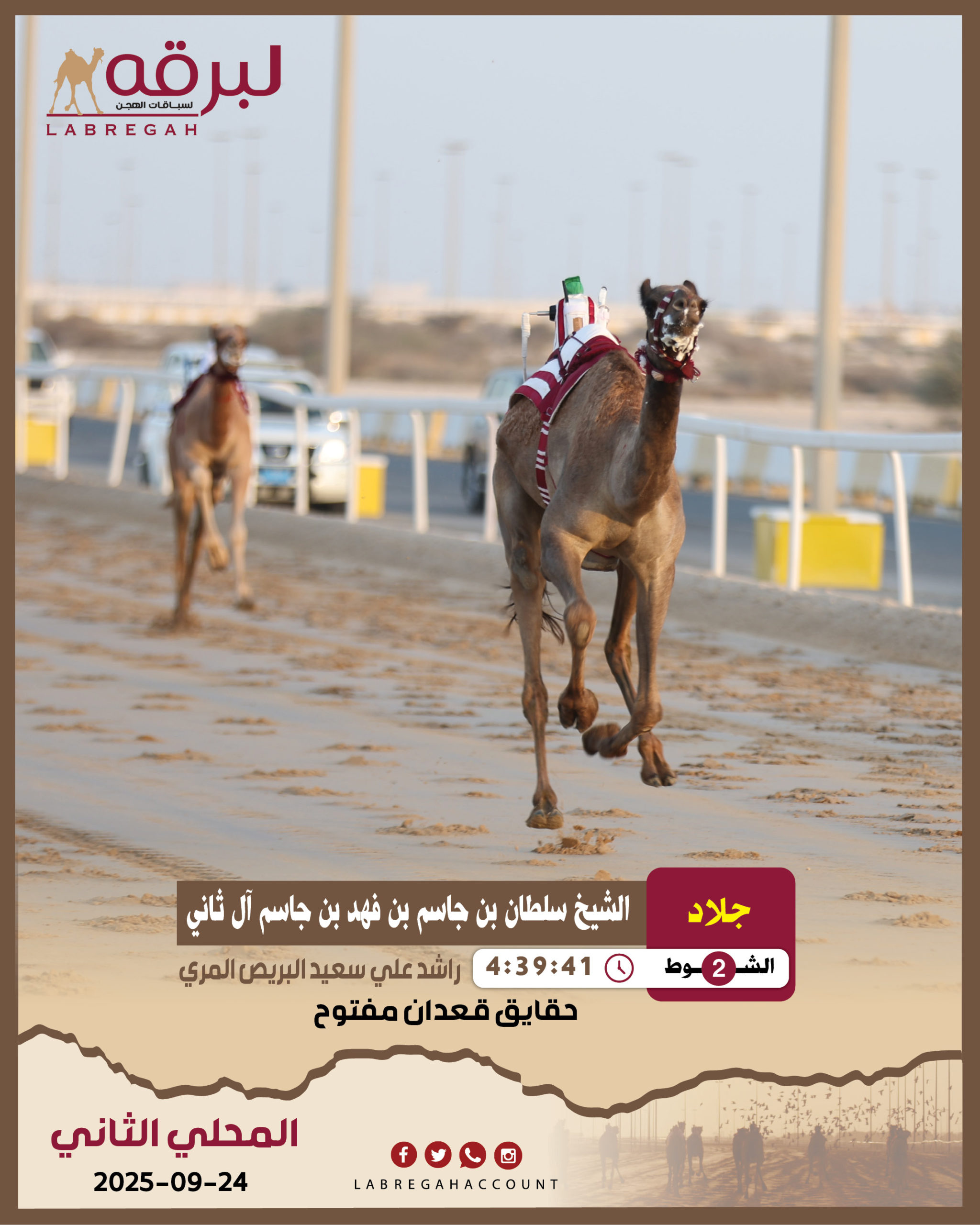 | الشوط الثاني | 1 | جلاد | الشيخ سلطان بن جاسم بن فهد بن جاسم آل ثاني | راشد علي سعيد البريص المري | 4:39:41 |