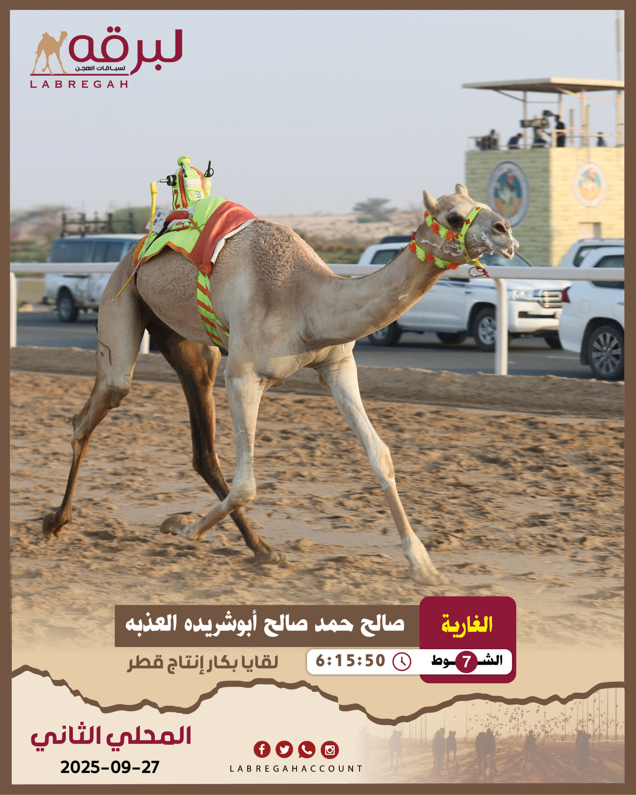 | الشوط السابع | 1 | الغارية | صالح حمد صالح أبوشريده العذبه | 6:15:50 |