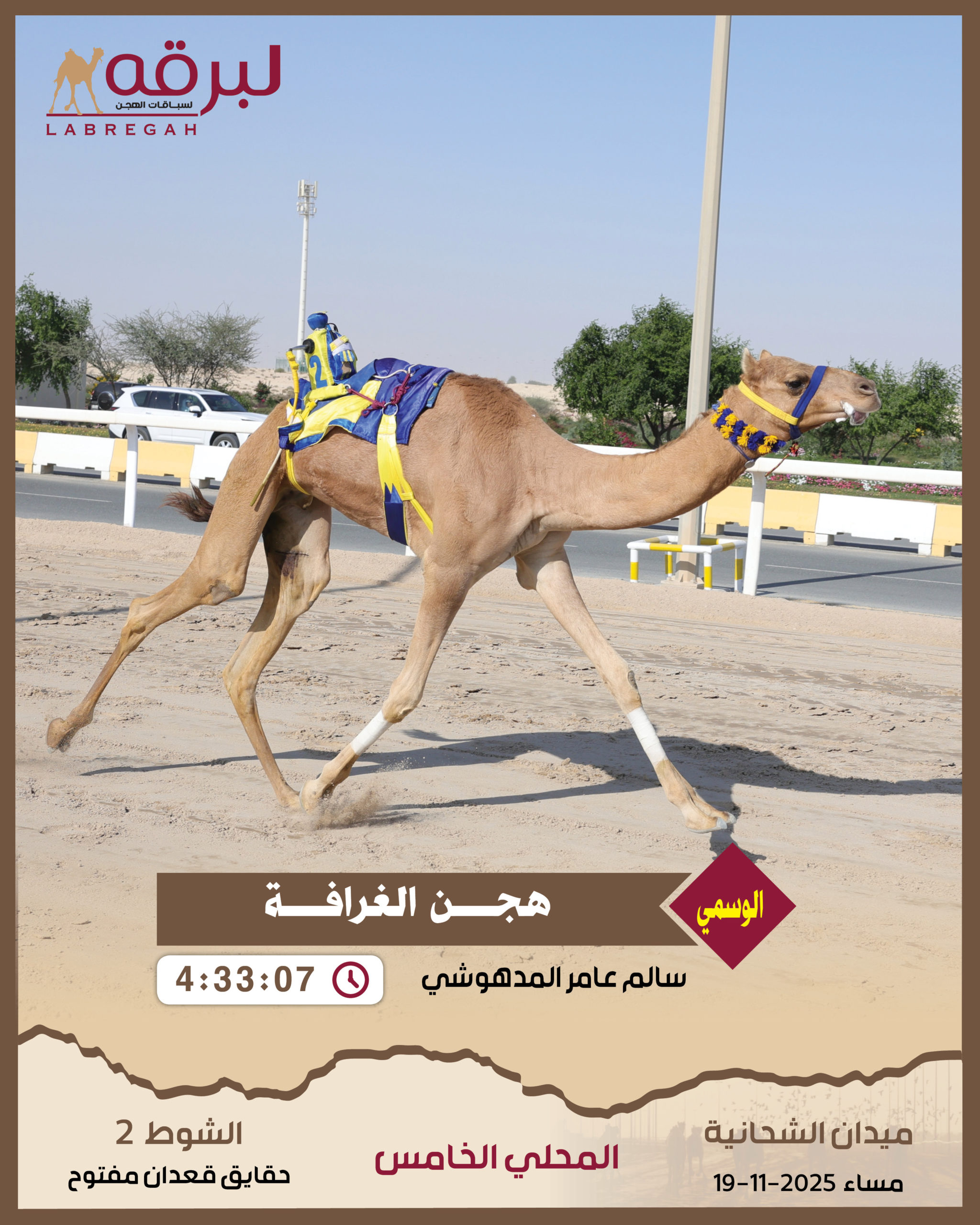 | الشوط الثاني | 1 | الوسمي | هجن الغرافة | سالم عامر المدهوشي | 4:33:07 |