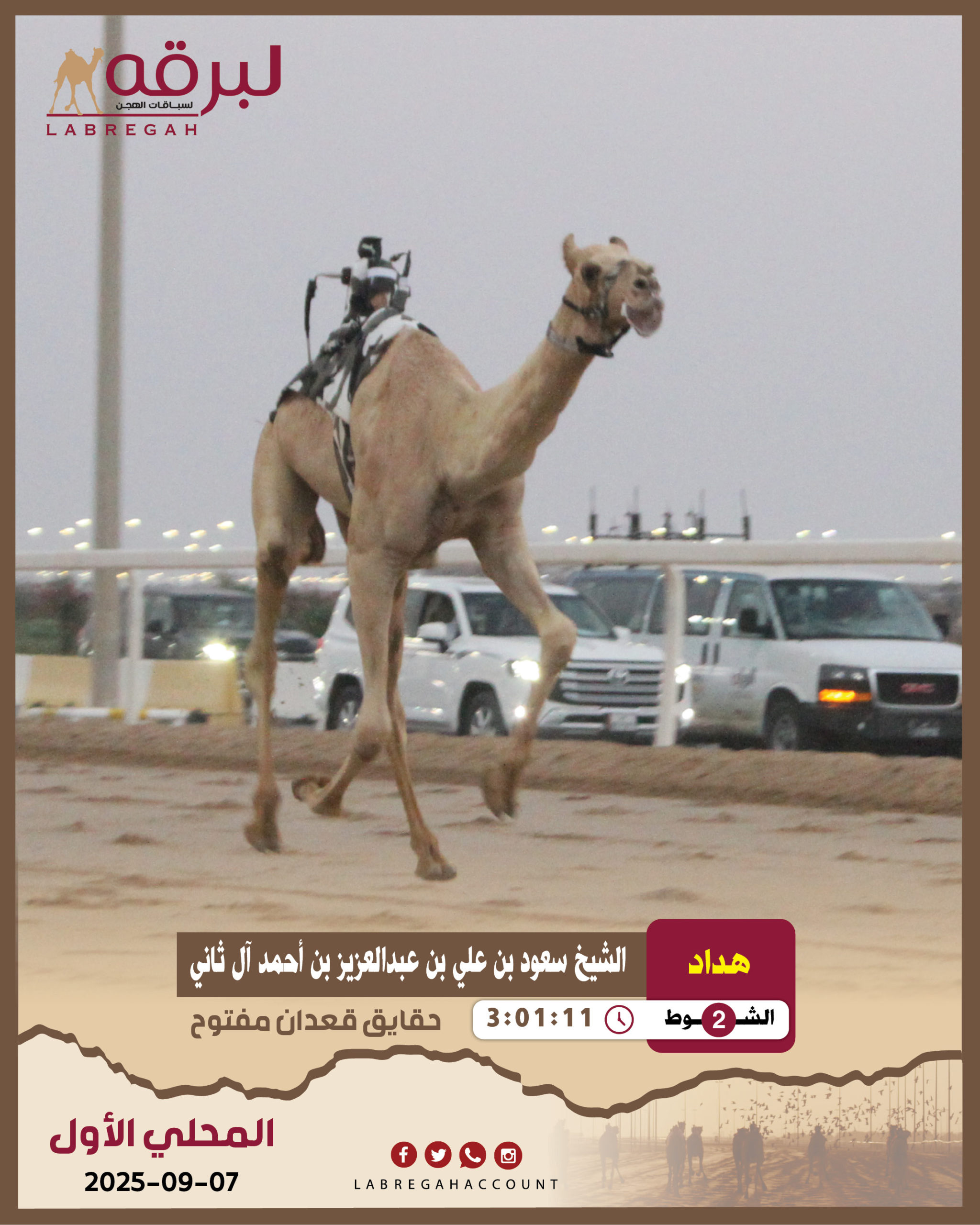 | الحادي عشر | 1 | سهم | هجن أم الزبار | محمد بخيت برقان المقارح | 3:06:43 |