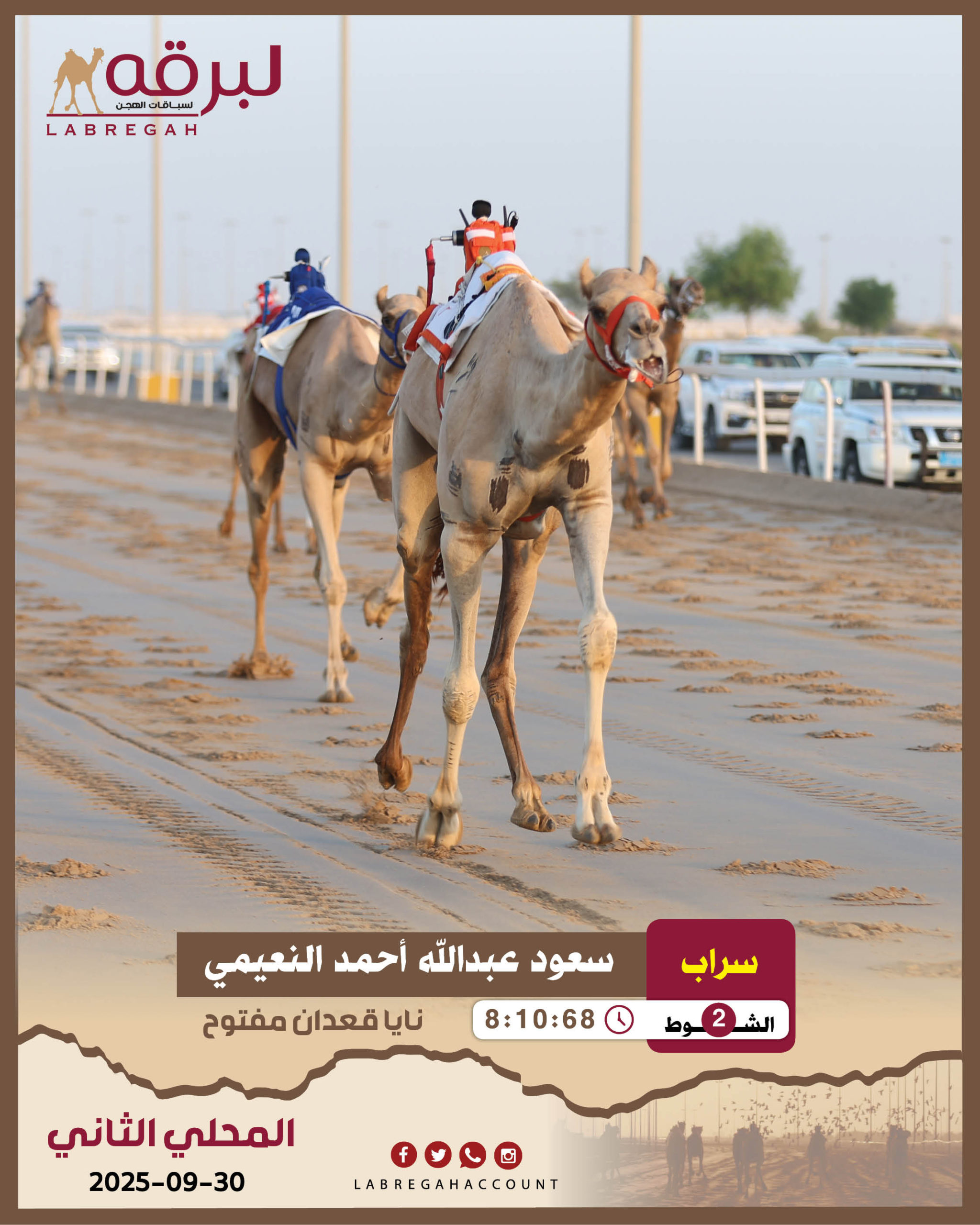 | الشوط الثاني | 1 | سراب | سعود عبدالله أحمد النعيمي | 8:10:68 |