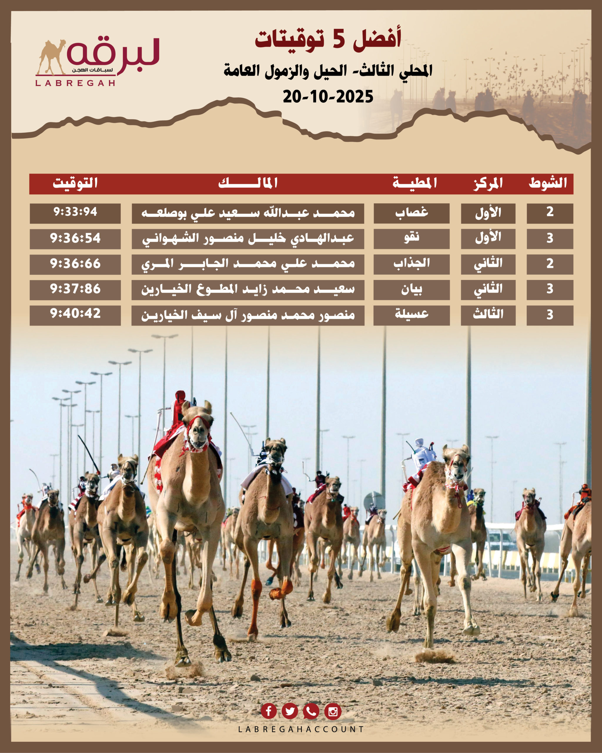 اختتمت صباح اليوم الإثنين 20 أكتوبر 2025، منافسات السباق المحلي الثالث بالنسبة لهجن أبناء القبائل، والتي خصصت لسن الحيل والزمول مفتوح وإنتاج، بتحديات 15 شوطًا من مسافة الـ 6 كم، حيث كان المتابعين على موعد مع المنافسة القوية والندية العالية، خاصة بعد مشاركة نخبة من أقوى العزب التي تمتلك هذه الفئة.
