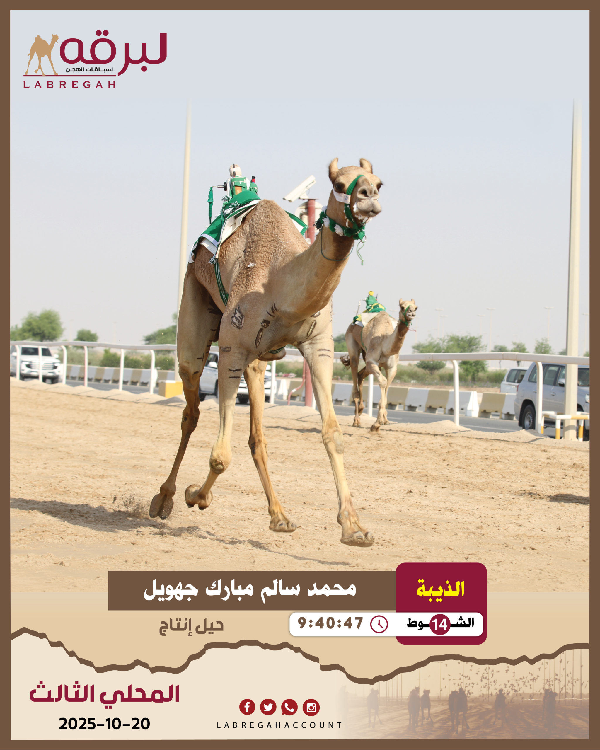 وفي شوط السباق الرابع عشر والمخصص للحيل إنتاج، فحمل توقيع “الذيبة” ملك محمد بن سالم مبارك بن جهويل، التي حلقت في سماء المنافسة وفرضت كلمتها في الوقت المناسب من نهاية الشوط، وفازت “الذيبة” بناموس الإنتاج في توقيت زمني قدره 9.40.47 دقيقة.