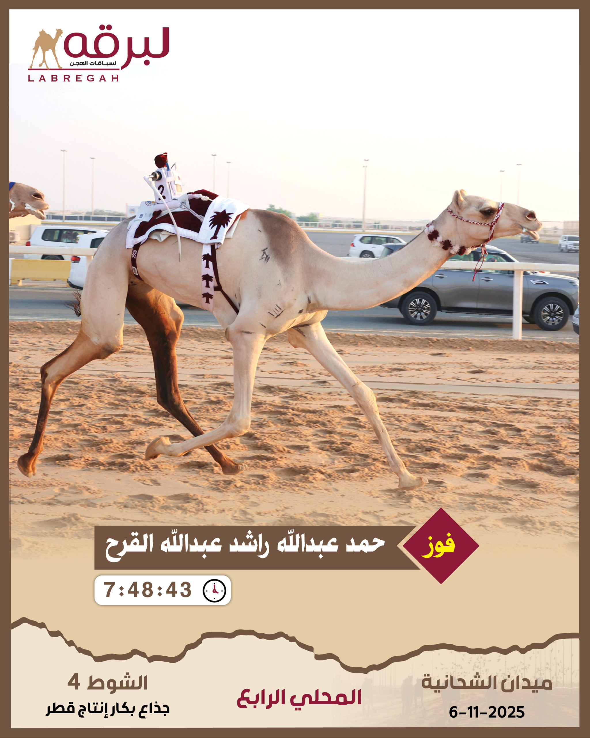 | الشوط الرابع | 1 | فوز | حمد عبدالله راشد عبدالله القرح | 7:48:43 |