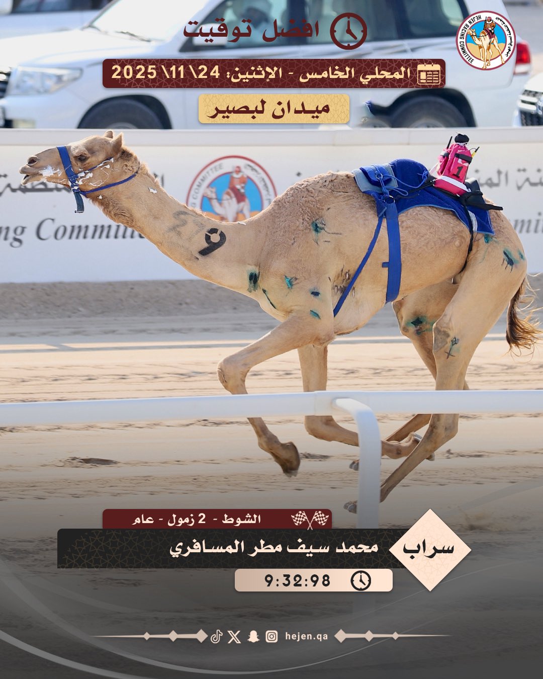 اختتمت مساء اليوم الإثنين 24 نوفمبر 2025، فعاليات ومنافسات السباق المحلي الخامس بميدان لبصير، حيث خصصت منافسات الأمسية لسن الحيل والزمول على مدار 6 أشواط من مسافة الـ 6 كم، وفيها..