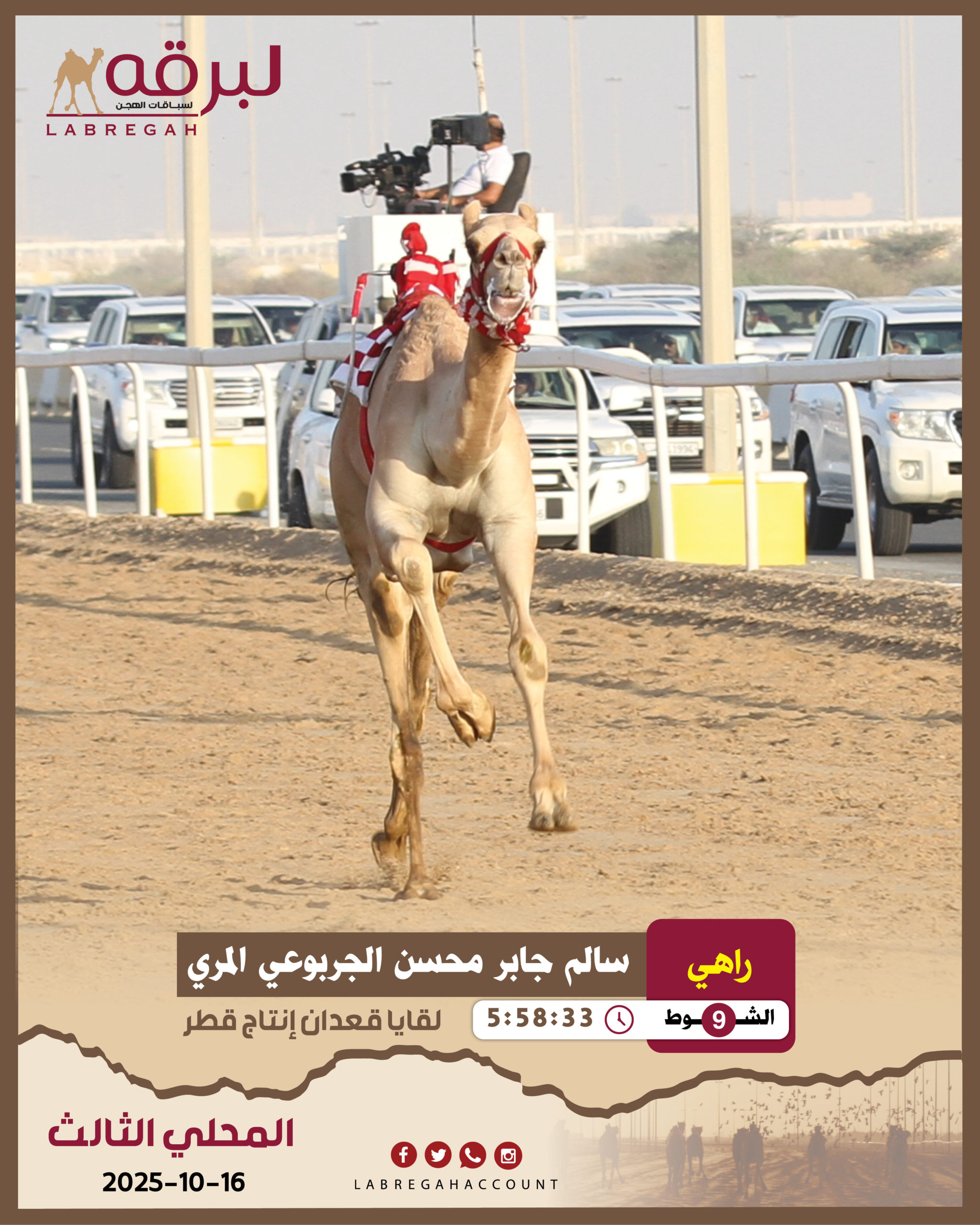 | الشوط التاسع | 1 | راهي | سالم جابر محسن الجربوعي المري | 5:58:33 |