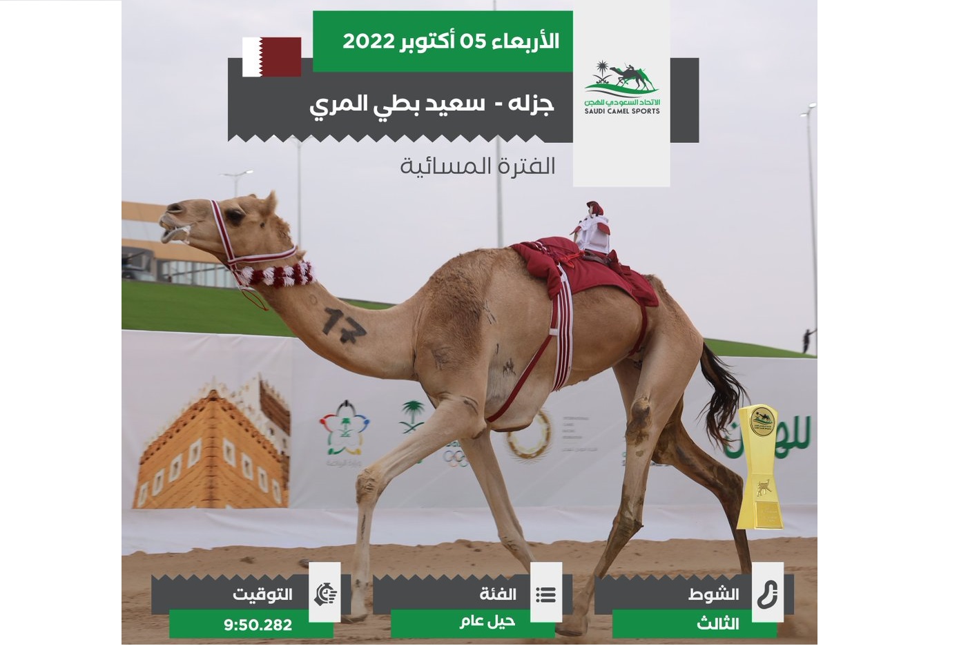 اسدل الستار مساء اليوم الأربعاء  أكتوبر 2022, على منافسات كأس الإتحاد السعودي للهجن والتي أقيمت فعالياتها على أرضية ميدان نجران للهجن, بمشاركة واسعة من هجن أصحاب السمو والسعادة الشيوخ وأيضا هجن أبناء القبائل من دول مجلس التعاون الخليجي.