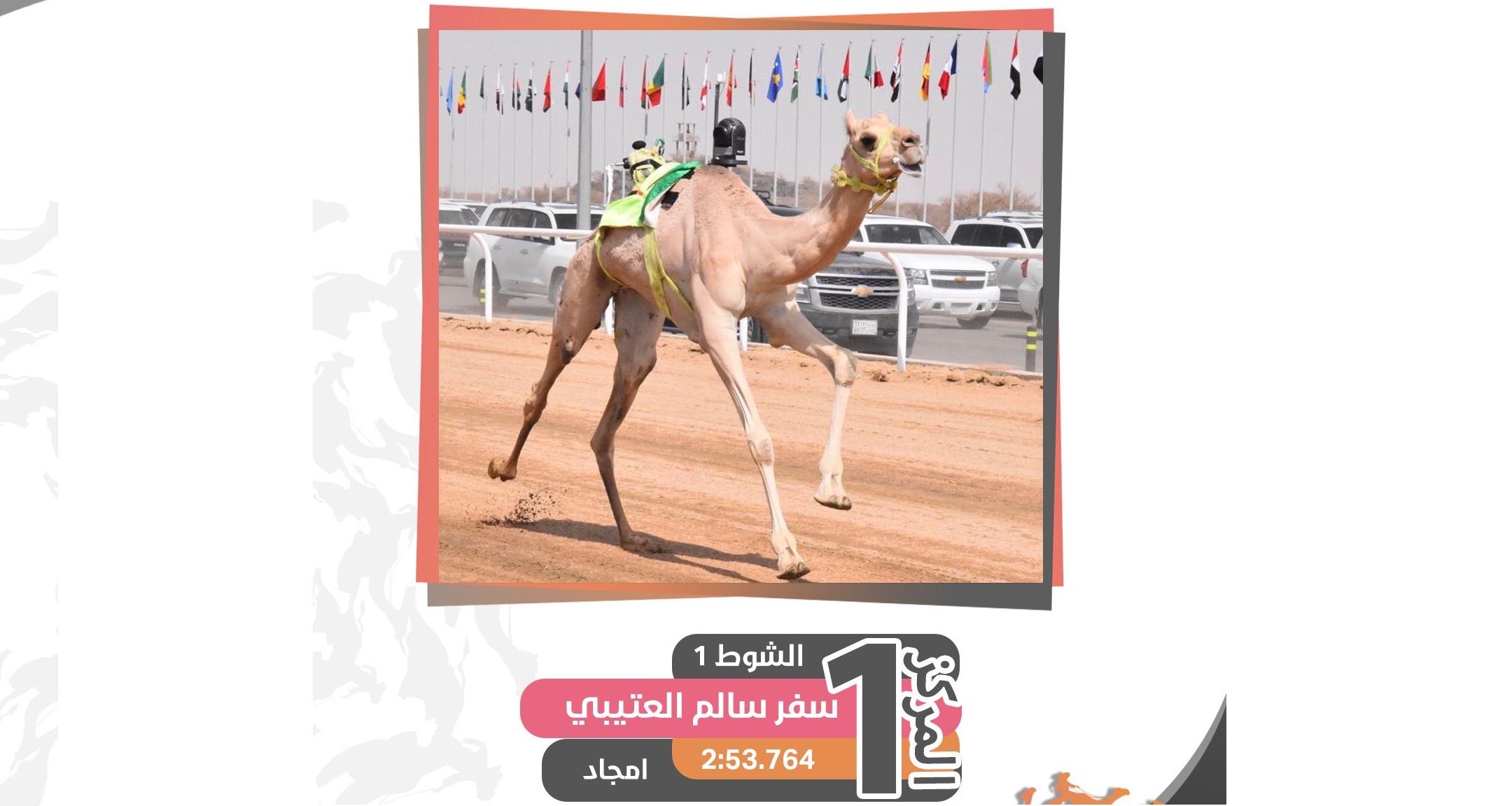 بالمقابل، تصدر “سياف” لعبدالله دخيل الله سلامه الجهني قمة الشوط الرئيسي للمفاريد قعدان عام، ليغرد بالناموس والجائزة المالية، ووصل “سياف” خط النهاية بعد 2.57.95 من رفع الإستارت، ليأتي “جارح” لعبدالله سالم القحطاني ثانيا بتوقيت 2.58.37، وثالثا كان “براق” لفيصل فهد فهيد الهاجري الذي سجل 2.58.67.