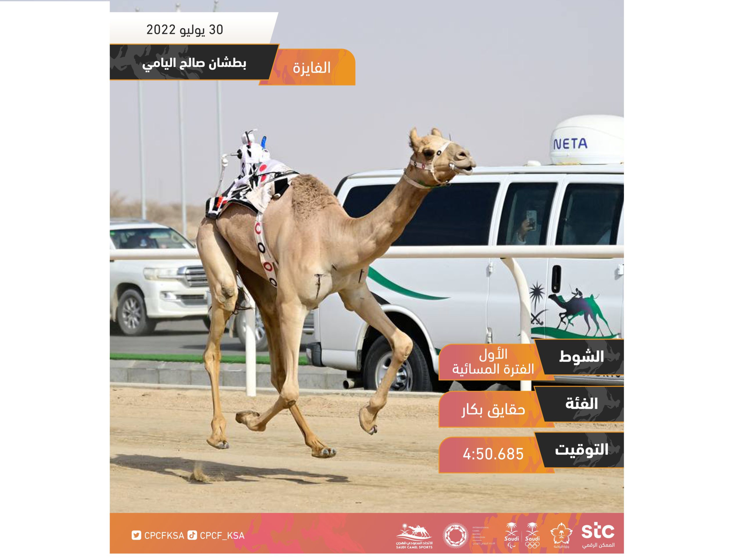 في شوط ناري ضم نخبة الهجن الحقايق البكار، استطاعت البكره “الفايزة” المملوكة لبطشان صالح المحامض اليامي أن تحسم اللقب بعد منافسة شرسة وقوية للغاية مع المشاركين معها في الشوط، حيث ظفرت “الفايزة” بالفوز بعد أن قطعت رحلة السباق في زمن وقدره 4.50.68 دقيقة، تاركة الوصافة لـ “الجذابة” ملك ماجد مذود عايد الشمري التي سجلت 4.52.11 دقيقة.