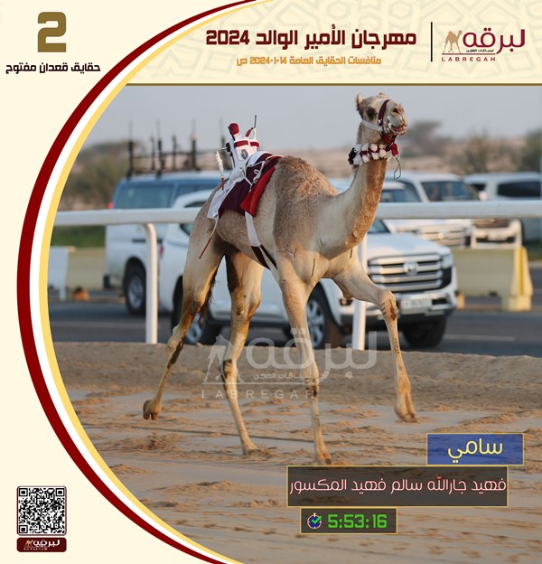 كما تألق «سامي» ملك فهيد جارالله سالم فهيد المكسور، في الشوط الثاني الرئيسي المخصص للحقايق قعدان مفتوح، وتسيد «سامي» أقوى أشواط القعدان بأداء مبهر محققاً الفوز والناموس في توقيت زمني قدره 5.53.16 دقيقة، متفوقاً على «معتاد» ملك راشد محسن علي طيثاب انديله، الذي حل وصيفاً للشوط القوي في توقيت زمني قدره 5.55.84 دقيقة.