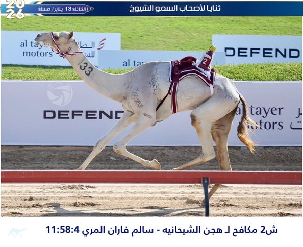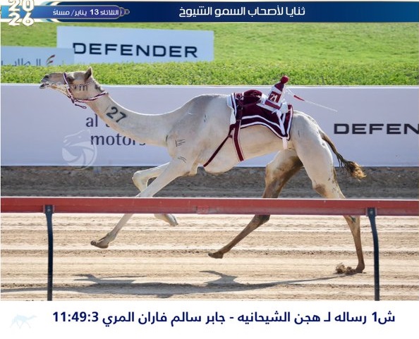 نجحت المطية «رسالة» ملك هجن الشحانية، بقيادة المضمر جابر بن سالم بن فاران المري، في الفوز بالكأس الذهبية المخصصة لشوط الثنايا بكار مفتوح الرئيسي، بعد تسجيل توقيت قوي وعالي المستوى ما أكسبها الصدارة في ذروة المنافسة بين نخبة مطايا أصحاب السمو الشيوخ.