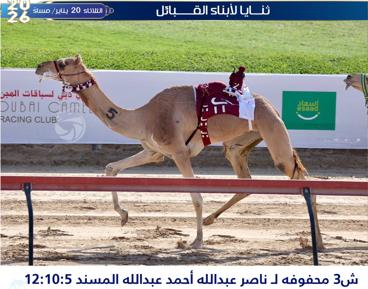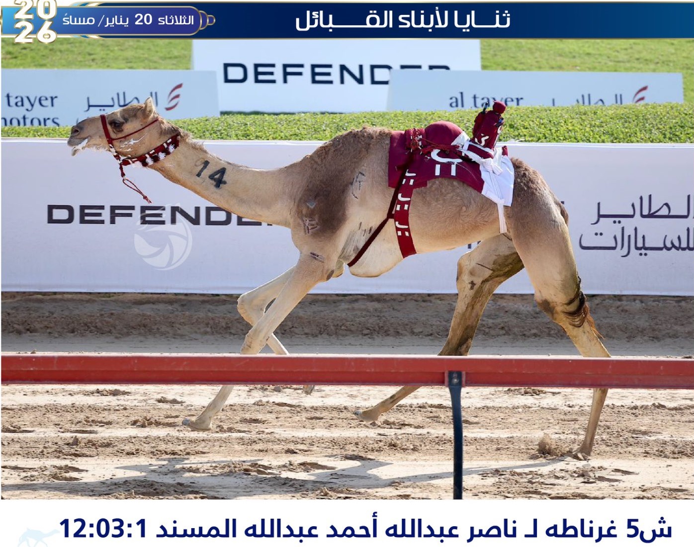 توج الأنيق ناصر بن عبدالله بن أحمد المسند، بكأسي الثنايا بكار محليات وإنتاج، مساء اليوم الثلاثاء 20 يناير 2026، اليوم قبل الختامي لمهرجان سمو ولي عهد دبي، المقام على أرضية ميدان المرموم، بإمارة دبي بالإمارات العربية المتحدة.