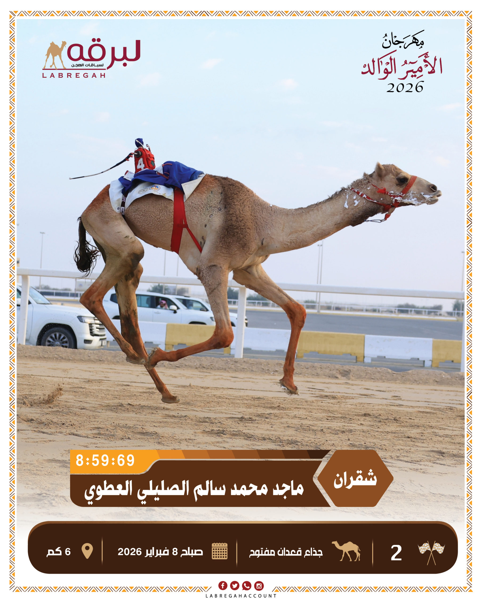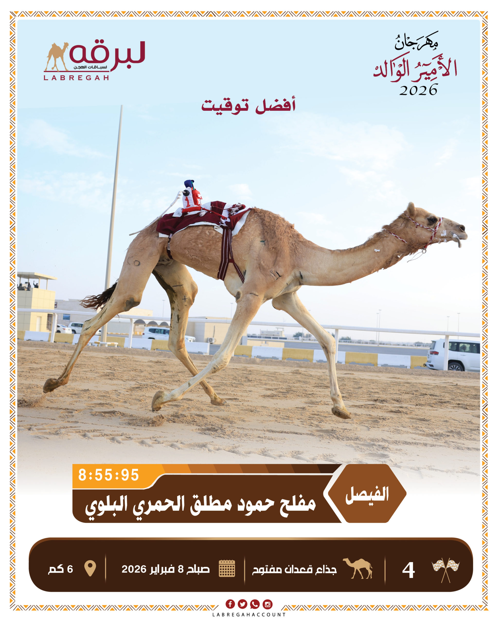 أما أفضل توقيت فسجل في شوط السباق الرابع تحت خف “الفيصل” ملك مفلح حمود مطلق الحمري البلوي، وذلك بعد قطع مسافة الستة كيلومترات في زمن قدره 8.55.95 دقيقة.
