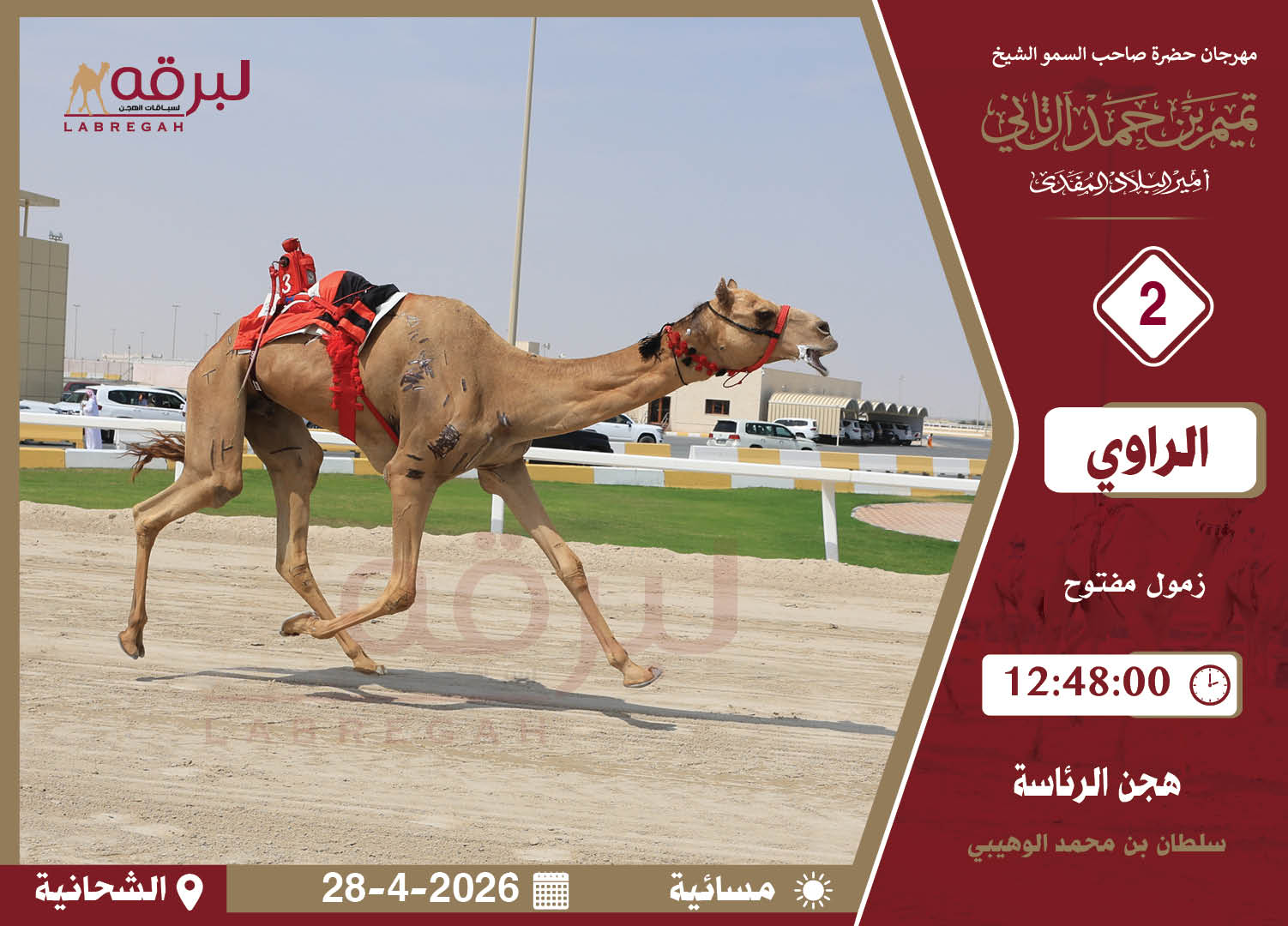 | الشوط الثاني | 1 | الراوي | هجن الرئاسة | سلطان بن محمد الوهيبي | 12:48.00 |