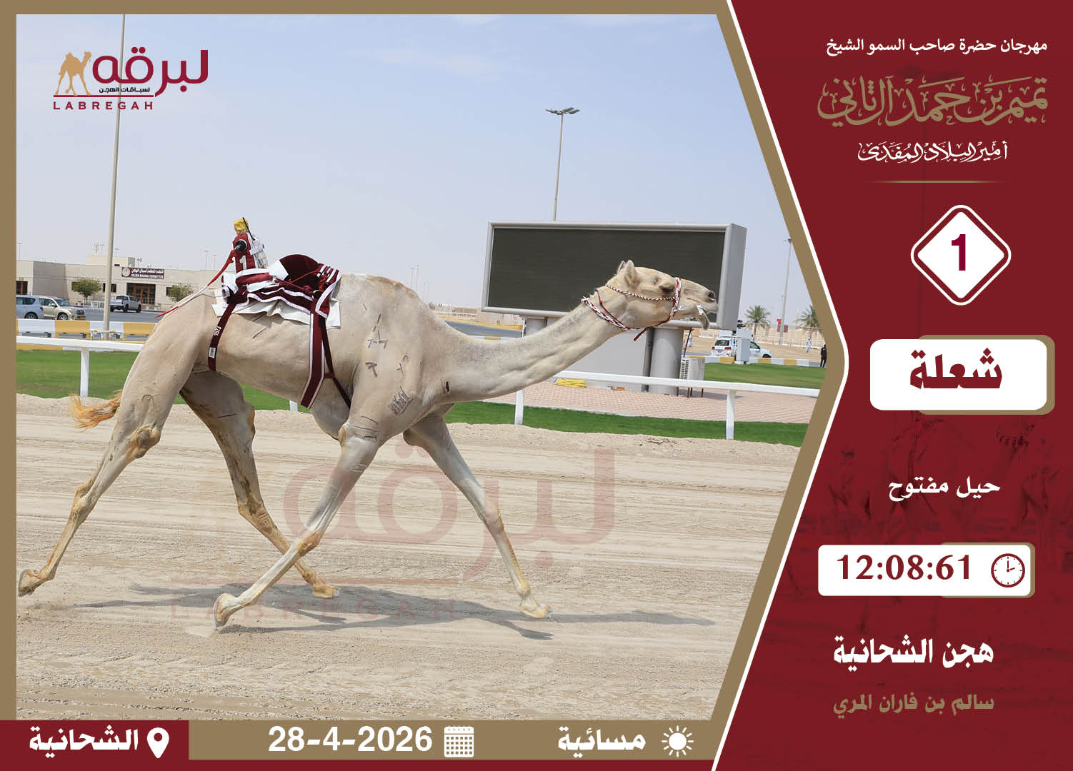 | حيل مفتوح | 2 | إنجاز | هجن الشحانية | جابر بن سالم بن فاران المري | 12:20.42 |