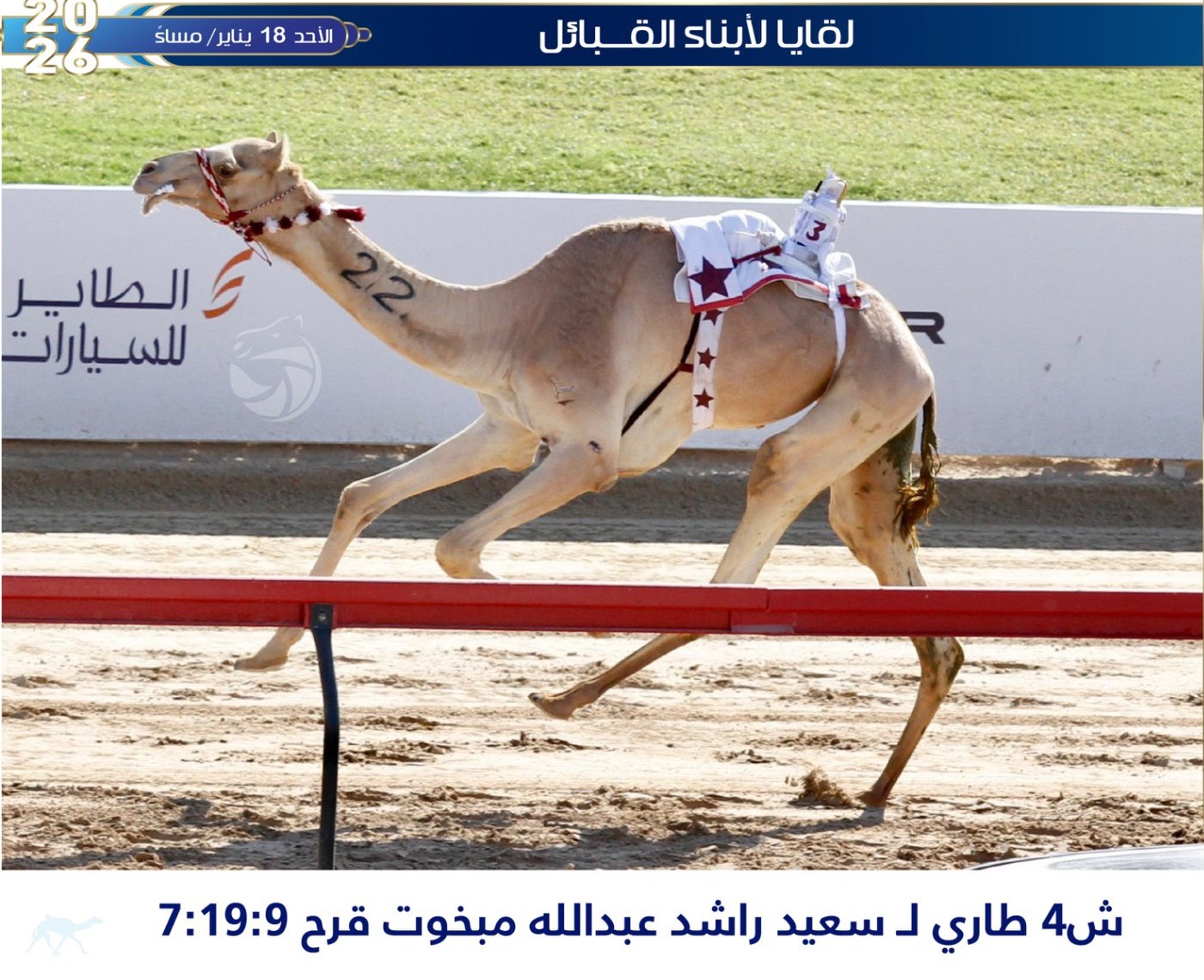 وانتزع “طاري” المملوك لسعيد راشد عبدالله مبخوت قرح، البندقية المخصصة لشوط اللقايا قعدان إنتاج، إلى جانب الجائزة المالية البالغة 800 ألف درهم إماراتي، بعدما قطع مسافة الـ 5 كم بزمن قدره 7.19.9 دقيقة.
